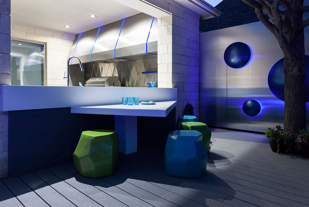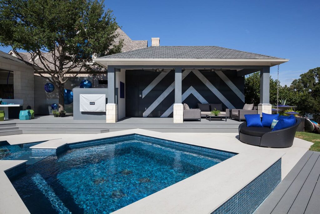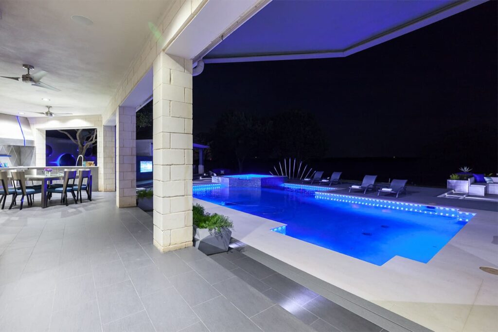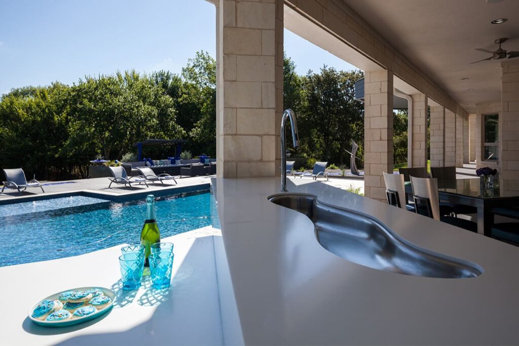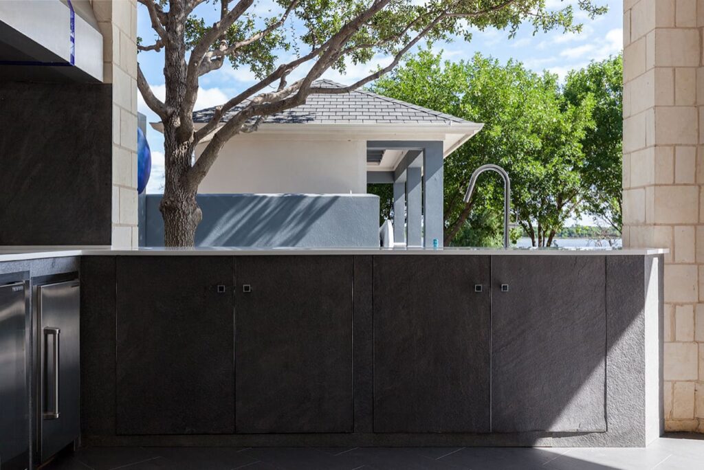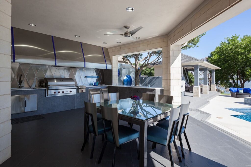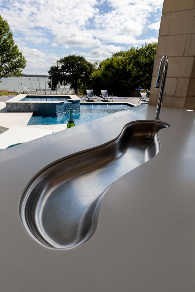 One step from a resort area is the response to this outdoor entertaining space. All seating is custom made metal and cushions are upholstered in Perennials fabric. One planter houses a lift TV. The surround of the pool is Dekton by Cosentino. The jewel of the design is the custom fabricated 16 grill vent good and the custom sculptured sources throughout the space. Many conversation areas and play areas.