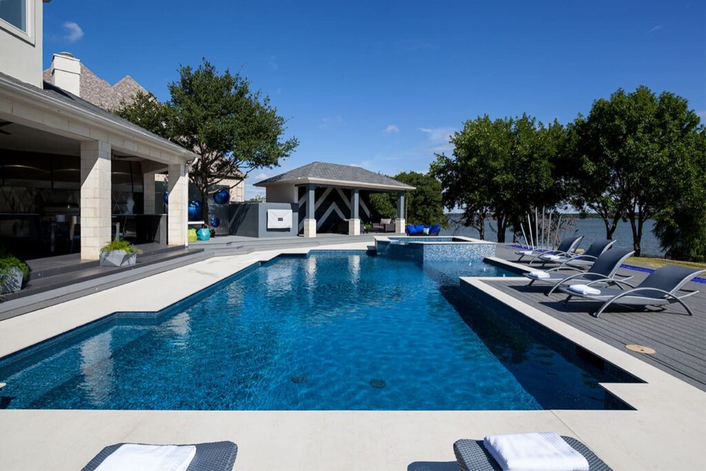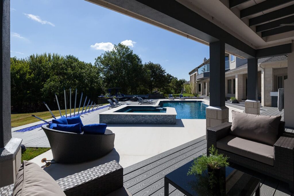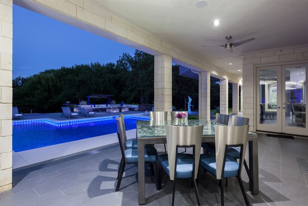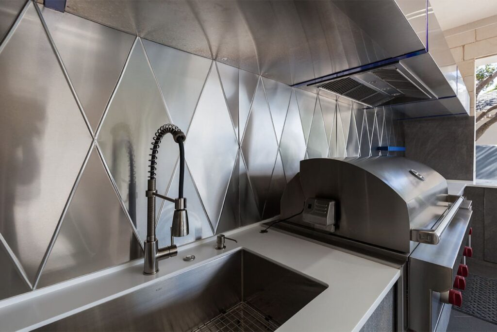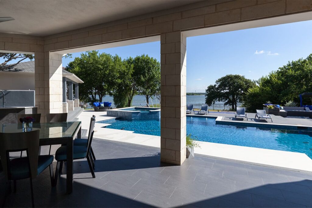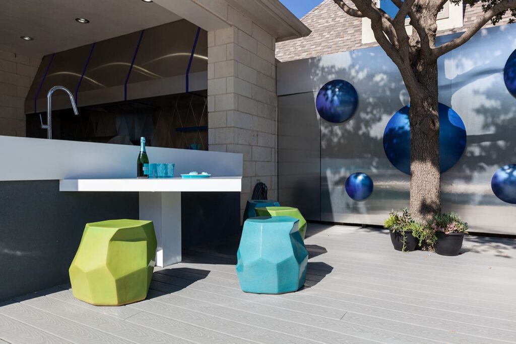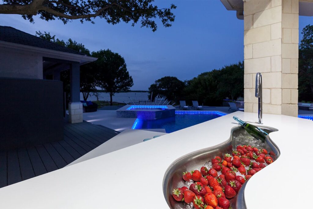 One step from a resort area is the response to this outdoor entertaining space. All seating is custom made metal and cushions are upholstered in Perennials fabric. One planter houses a lift TV. The surround of the pool is Dekton by Cosentino. The jewel of the design is the custom fabricated 16 grill vent good and the custom sculptured sources throughout the space. Many conversation areas and play areas.