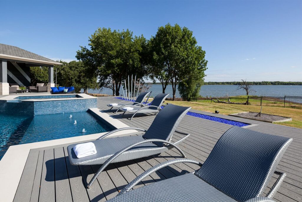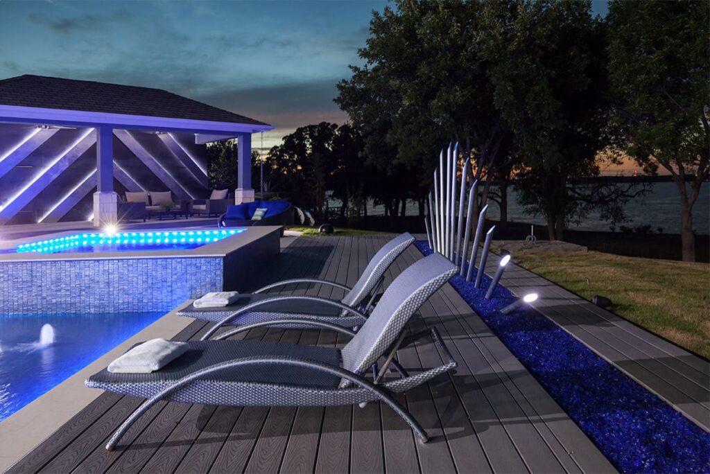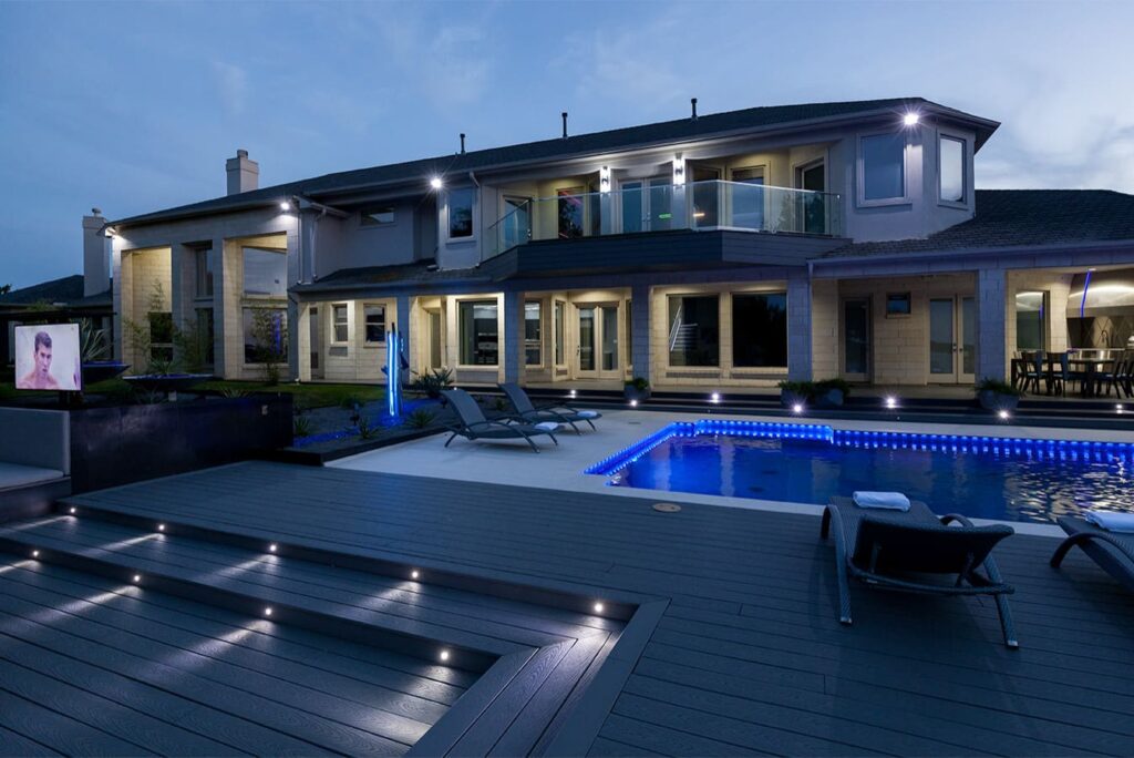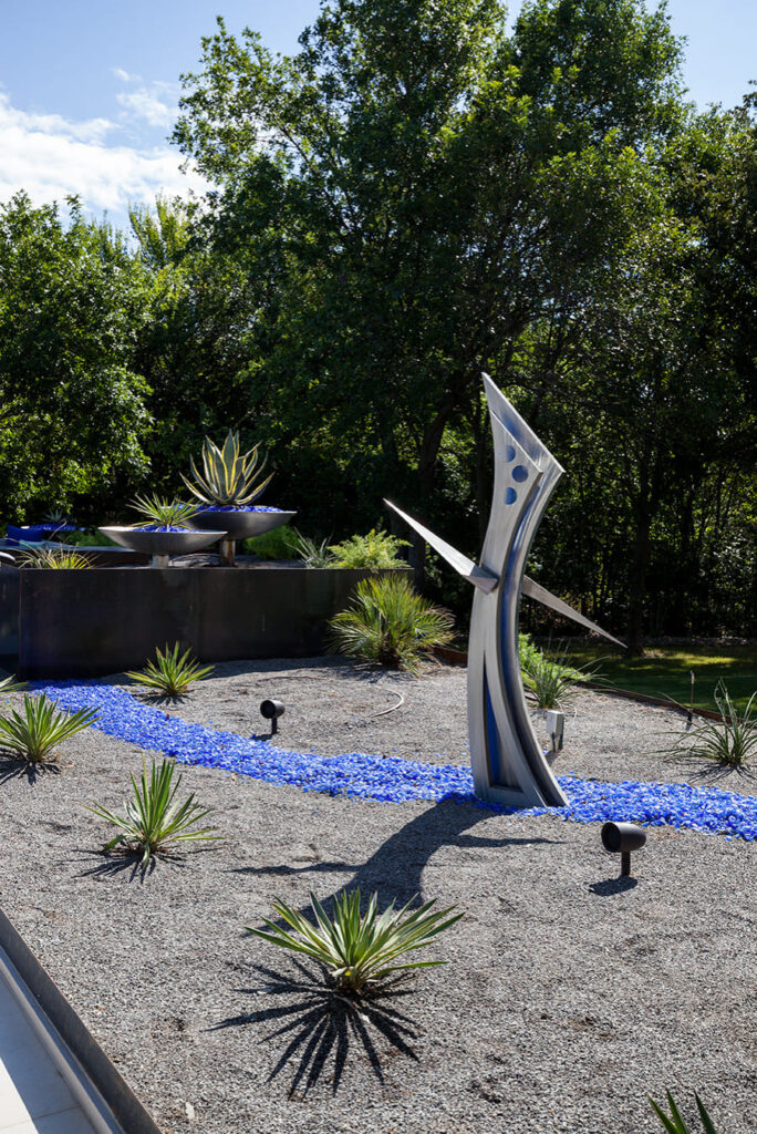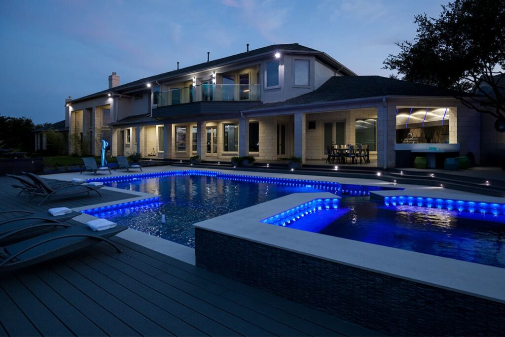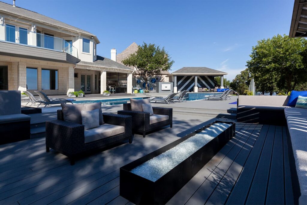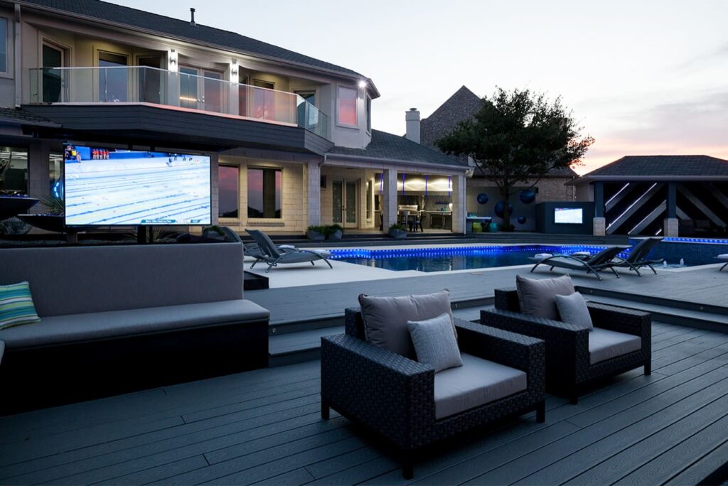 One step from a resort area is the response to this outdoor entertaining space. All seating is custom made metal and cushions are upholstered in Perennials fabric. One planter houses a lift TV. The surround of the pool is Dekton by Cosentino. The jewel of the design is the custom fabricated 16 grill vent good and the custom sculptured sources throughout the space. Many conversation areas and play areas.