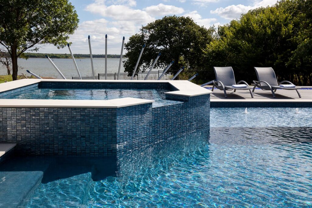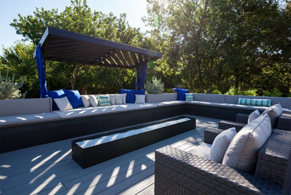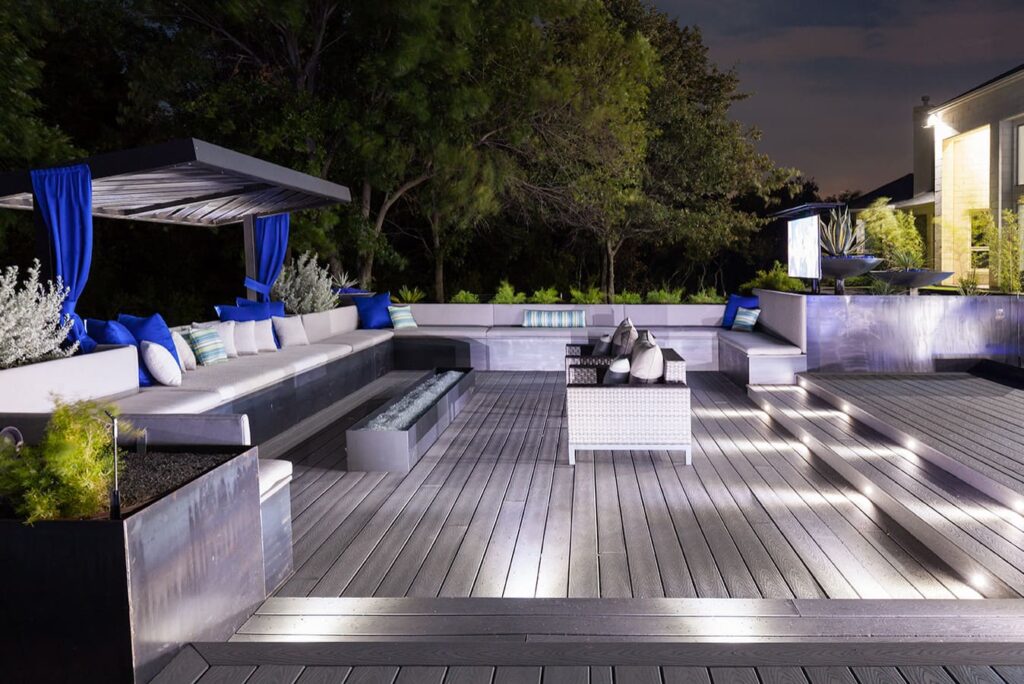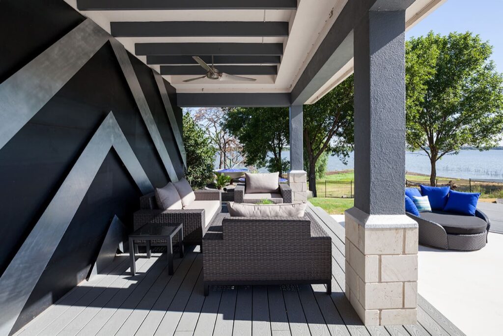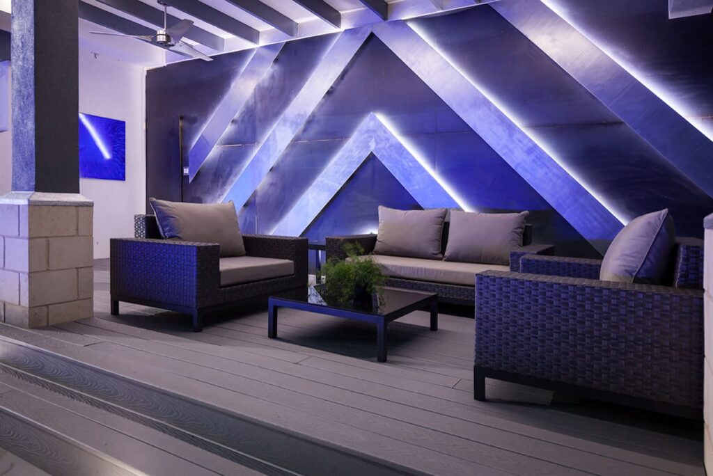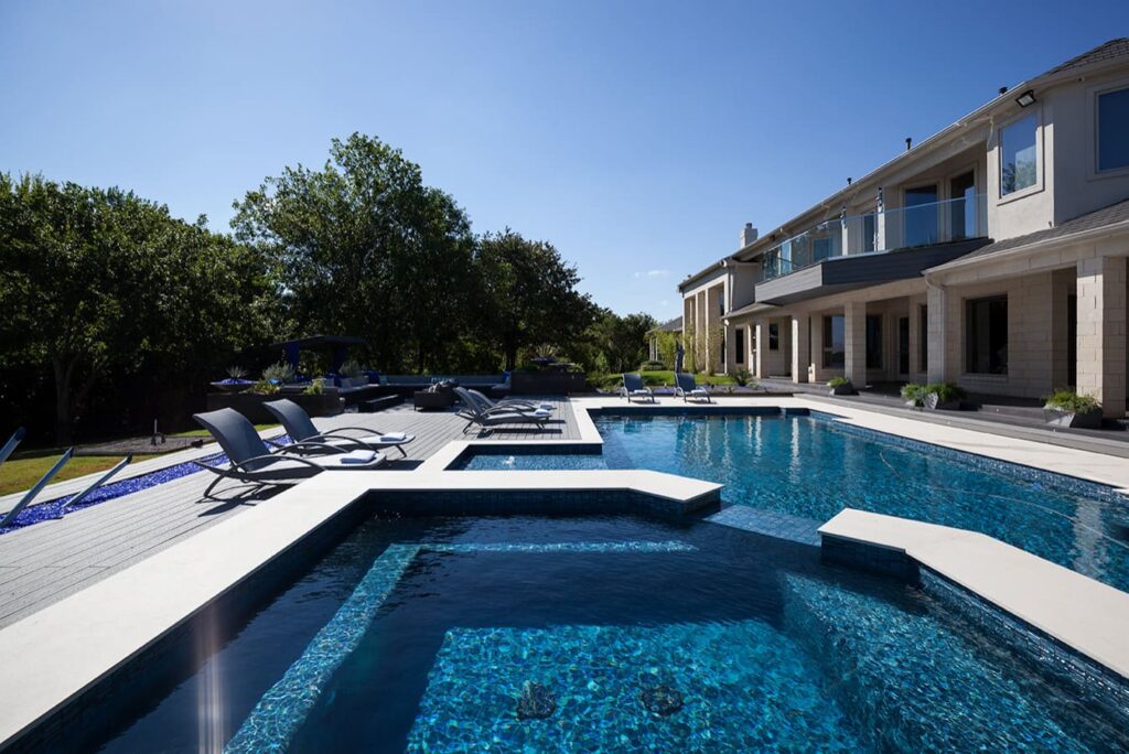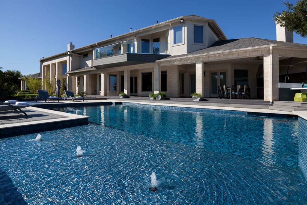 One step from a resort area is the response to this outdoor entertaining space. All seating is custom made metal and cushions are upholstered in Perennials fabric. One planter houses a lift TV. The surround of the pool is Dekton by Cosentino. The jewel of the design is the custom fabricated 16 grill vent good and the custom sculptured sources throughout the space. Many conversation areas and play areas.